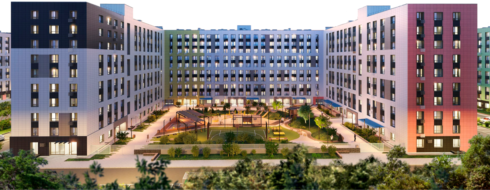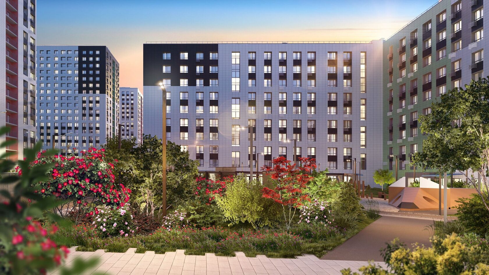 Спортивные зоны для баскетбола, волейбола, футбола, workout-тренировок — прямо во дворе. В соседнем районе — ТЦ “МЕГА”, “Икеа”, “OBI”, “Castorama”.